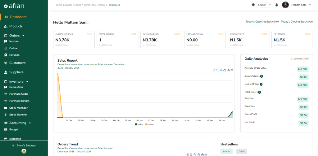 Sales are recorded through a separate point-of-sale (POS) application, which runs on mobile phones and web browsers. Cashiers or sales reps can log transactions, accept cash payments, transfers, or card payments, and assign sales to specific users. Every transaction instantly syncs back to the merchant’s backend dashboard, which enables owners to monitor sales remotely. Merchants can also sell through Afiari’s marketplace, which reflects live stock availability. The marketplace is currently live but will be relaunched under a separate brand. Only merchants already using Afiari’s operational software are allowed to sell on the marketplace.