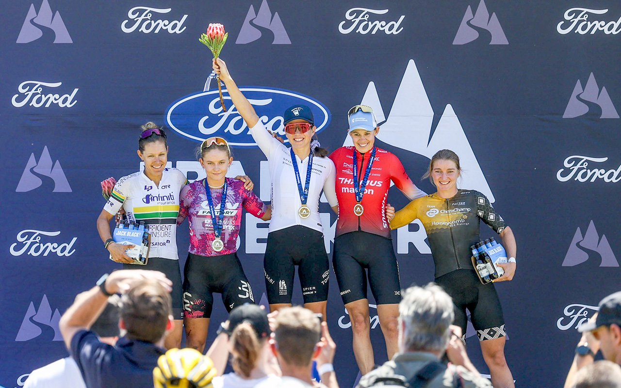 Main Photo Caption: Ford Trailseeker Banhoek Elite Women’s Podium (from left): Vera Looser, Tyler Jacobs, Round 1 champion Candice Lill, Alessandra Keller, and Hayley Preen in the Banhoek Valley on Saturday, 31 January, 2026. All Photos: Sam Clark