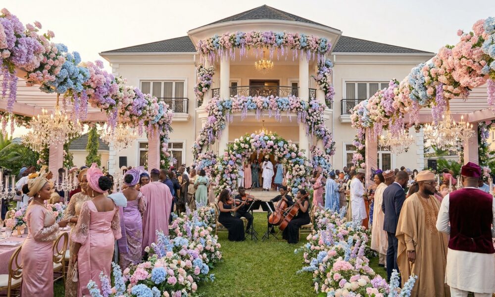 First, find an uncle who lives in a mansion with a compound large enough to fit at least twenty cars. Next, buy pastel-coloured flowers. A truck full, if possible. Every fence, every gate, and a Versace or big luxury logo proudly displayed on the entrance must be hidden beneath flowers. White draped fabric should cover the rest of the interior. Hang vintage lanterns among the flowers and along the gate. Use pastel napkins for the tables. Install a fountain that flows from the statue of your grandfather, Olayinka the Great, maybe?. If such a statue does not exist, commission one. That is simply the price you pay for the Bridgerton wedding of your dreams.