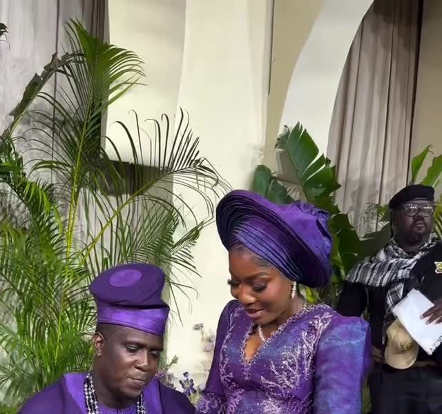 In keeping with Yoruba traditional wedding customs, the groom is asked to present money known as ‘owo obe‘ to his new bride. This serves as proof of his ability to take care of her, and this groom sure understood the assignment. Draped in stunning purple Aso-oke, he reaches into his pocket and pulls out wads of cash in different currencies, handing them over to his beaming bride. Seated gracefully on his lap, she dances with joy, clearly thrilled by the generous amounts being gifted to her. The money keeps flowing in bundles, and she flaunts each one, waving them in the air for all to see while playfully asking for more. It’s such a delightful and entertaining moment, and we absolutely love it for them!